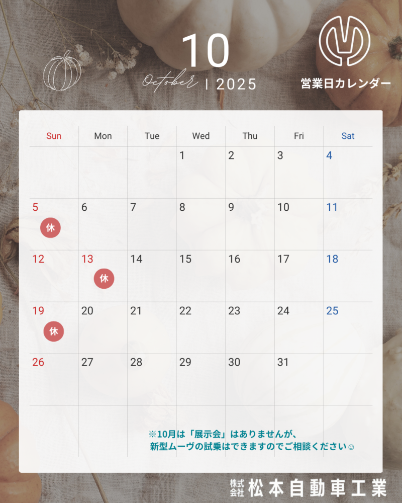 店休日 10/5㈰・10/13㈷・10/19㈰