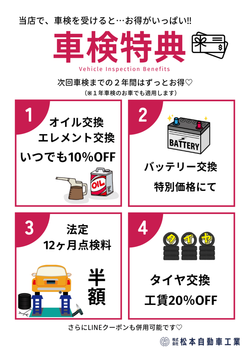 News ニュース トップページ ニュース 車検特典(#^.^#) ニュースnews 車検特典(#^.^#) 2026.01.06 当店で車検を受けると・・・お得がいっぱいなんです🤩 日頃のメンテナンスもお得に受けることが出来ます! 車検は満了日の2ヶ月前から受けれます。ご予約お待ちしています😄 ニュース一覧を表示