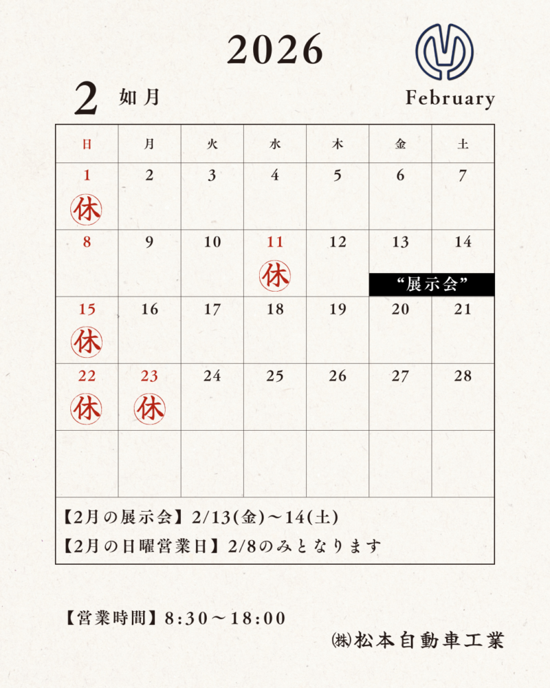 News ニュース トップページ ニュース 2月の店休日と展示会のお知らせ ニュースnews 2月の店休日と展示会のお知らせ 2026.01.25 【2月の日曜営業】2月8日(日)のみ 【展示会】2/13(金)~2/14(土) ※2~3月は繁忙期となり入庫台数が激増します。車検等のご予約はお早めにご検討くださいませ^^ ニュース一覧を表示